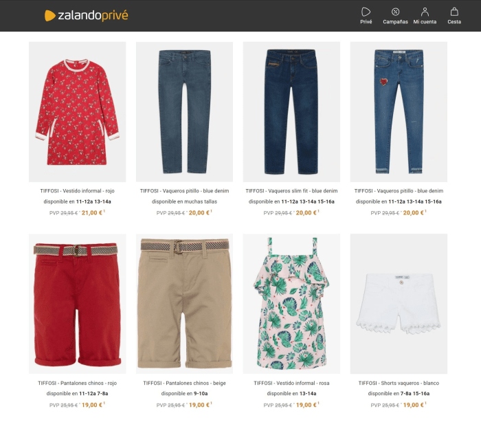La variedad es también la nota dominante en esta sección de Tiffosi Outlet, donde podemos lanzar ofertas sobre todo tipo de prendas, ya sean novedades actuales o de colecciones pasadas, de la temporada de primavera verano o de otoño invierno. Para descubrirlo sólo tienes que registrarte gratis en Privé by Zalando. ¡Formar parte de nuestra plataforma te hará conseguir descuentos de hasta -75%* de cientos de marcas de ropa, zapatos y complementos!